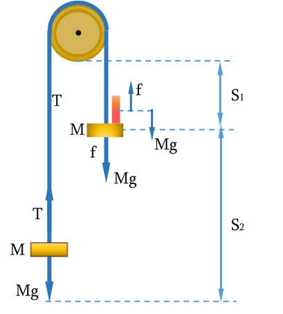 - სისტემა დაიწყებს აჩქარებულ მოძრაობას S1 მანძილის გავლამდე; S1 მანძილის დასრულების მომენტში სისტემას მოშორდება ლითონის დისკო და ამის შემდეგ გადაბმული სხეულები მოძრაობას გააგრძელებენ მუდმივი სიჩქარით;