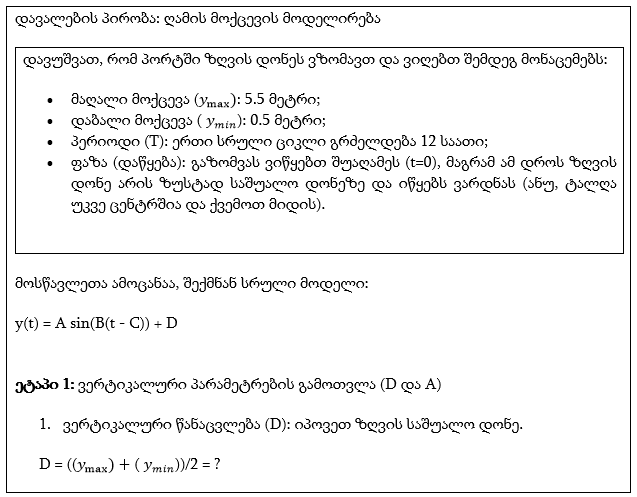 | რეალური პერიოდული მოვლენების (ტალღა, ტემპერატურა) აღსაწერად y(t) = A sin(B(t-C)) + D ფორმულის საშუალებით რეალური სიტუაციის მოდელირება და მომავალი მდგომარეობის გამოთვლა. | პერიოდული მოვლენების და მათი აღმწერი ფუნქციების გრაფიკების განხილვა. პარამეტრების (A, B, C, D) კვლევა/ანალიზი. | ფუნქციური დამოკიდებულებებისა და ტრიგონომეტრიული იგივეობების ანალიზი. მსჯელობა: ლოგიკური დასკვნების გამოტანა. (მიზეზ-შედეგობრივი კავშირი პარამეტრებსა და გრაფიკს შორის). |