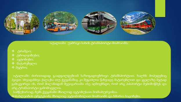 მე-9 კლასელი საბა საპონჯიანი ასე აღწერს იტალიის სატრანსპორტო სისტემას.