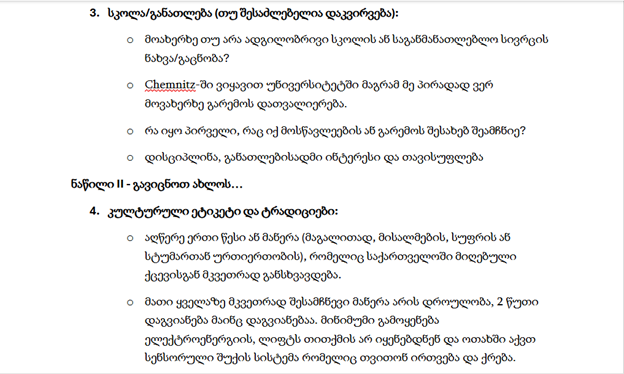 - კითხვარზე დაყრდნობით მოამზადე მოკლე პრეზენტაცია (5-7 წუთი) და აჩვენე 3 მსგავსება და 3 განსხვავება მასპინძელ ქვეყანასა და საქართველოს შორის;