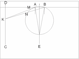 კუთხე AEB ჩახაზული კუთხეა და გამოითვლება AB რკალის ორზე გაყოფით, ხოლო კუთხე AKB მკვეთი კუთხეა და არის MN და AB რკალების სხვაობის ნახევარი.