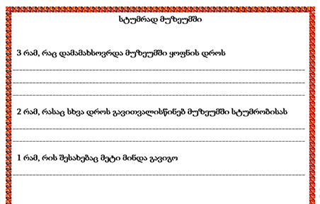კითხვები სრულიად მოიცავდა მუზეუმში მოსმენილ და ნანახ მასალას. დახმარება გამიწია სტუდენტებმა, რომლებიც სკოლაში შესაბამის პრაქტიკას გადიოდნენ, თუმცა ასეთ დროს შეგიძლიათ დახმარება სთხოვოთ კოლეგებსაც.