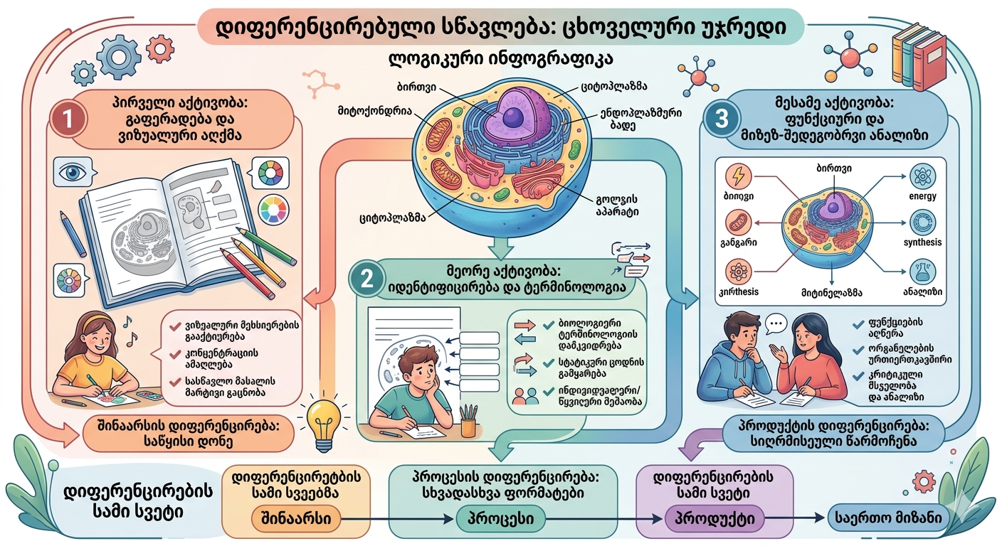 შინაარსის დიფერენცირება გულისხმობს, რომ მასალას მოსწავლეები განსხვავებული სიღრმითა და მხარდაჭერით შეიმეცნებენ. გაფერადების დავალება მიმართულია თემის პირველ ეტაპზე მიმოხილვისა და ორგანელების ვიზუალური გარჩევისაკენ. სახელწოდებების მიწერა კი მიზნად ისახავს ტერმინოლოგიის ათვისებასა და სტრუქტურების იდენტიფიკაციას. რაც შეეხება სახელწოდებებით მონიშნულ სქემაზე ფუნქციების განხილვას, აღნიშნული აქტივობა მოითხოვს ცოდნის უფრო მაღალ დონეზე გააზრებასა და კონცეფციის ინტეგრირებას.