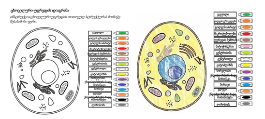 პირველი დავალება გულისხმობს უჯრედის ორგანელების გაფერადებას და მიზნად ისახავს მოსწავლეთა ვიზუალური აღქმის განვითარებას. განსაზღვრული ფერების გამოყენებით უჯრედის სტრუქტურების გამოკვეთა ხელს უწყობს ორგანელების უკეთ გარჩევას, კონცენტრაციის გაძლიერებასა და ვიზუალური მეხსიერების გააქტიურებას. აღნიშნული აქტივობა მეტად პროდუქტიულია სასწავლო თემის გაცნობის საწყის ეტაპზე, ვინაიდან ამარტივებს ახალი ინფორმაციის აღქმასა და ორგანიზებას. ამასთან, მსგავსი ტიპის დავალება განსაკუთრებით ეფექტურია იმ მოსწავლეებისათვის, რომლებიც შემეცნების პროცესში უპირატესობას ანიჭებენ გრაფიკულ, თვალსაჩინო რესურსებს და ამ გზით უფრო მარტივად ითვისებენ ახალ მასალას.