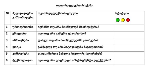 ეს ცხრილი დაგეხმარებათ, გაკვეთილის შემდეგ სულ რამდენიმე წამში დაინახოთ თქვენი ძლიერი მხარეები და ის სეგმენტები, რომლებიც ხვალ მეტ ყურადღებას მოითხოვს. აღსანიშნავია, რომ მიზანი არის არა სრულყოფილება, არამედ მუდმივი განვითარებაა.