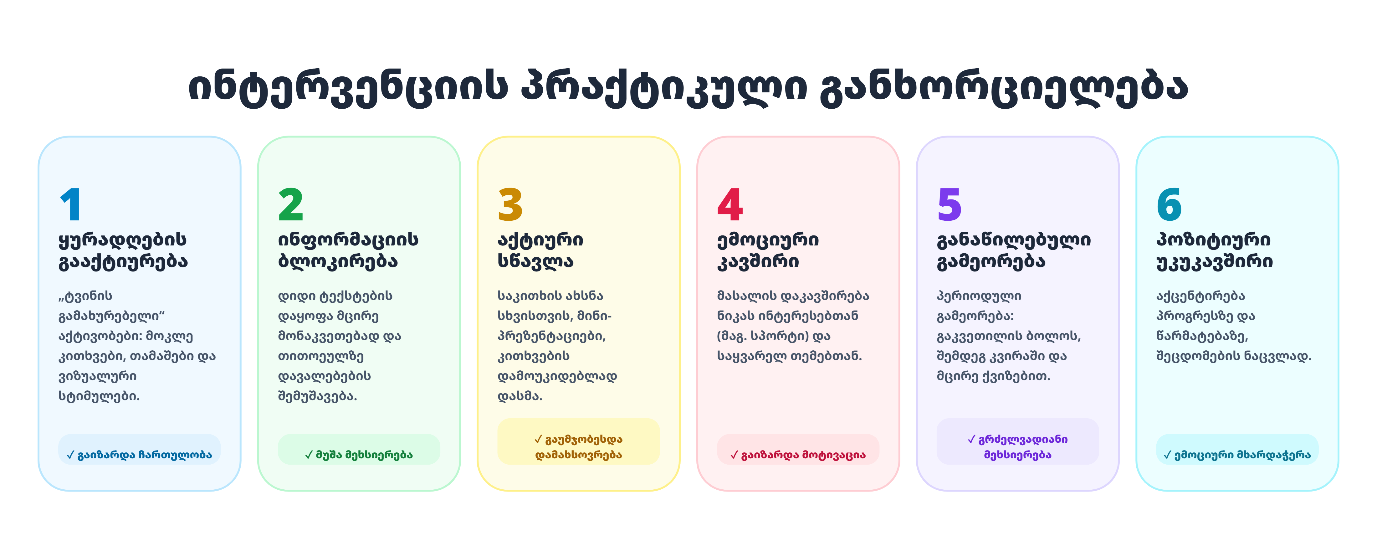 მასალა პერიოდულად მეორდებოდა: გაკვეთილის ბოლოს, შემდეგ გაკვეთილებზე, მცირე ქვიზებით. შედეგად, გრძელვადიანი მეხსიერება გაძლიერდა.